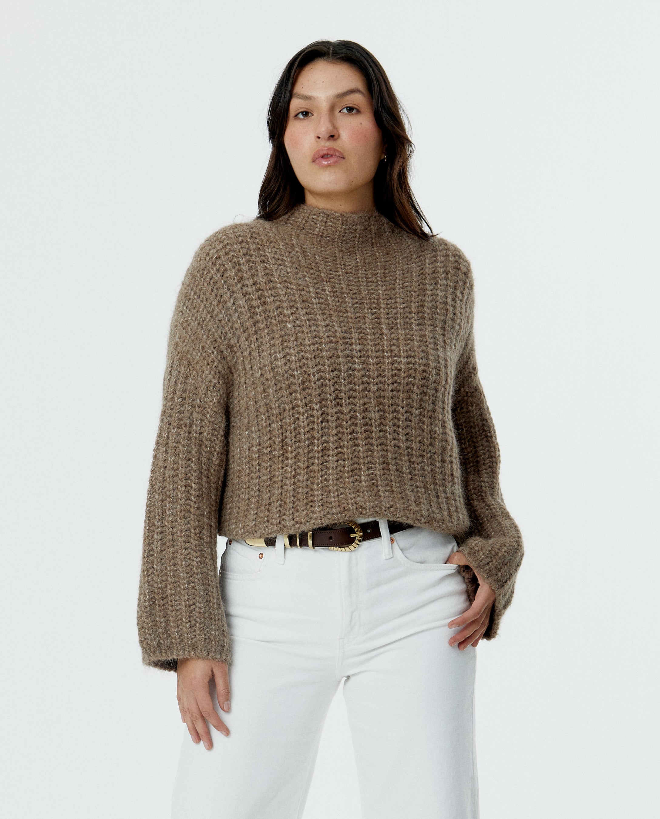 The Lita Mockneck is knit from Tirarik yarn, an airy-yet-warm blend known for its soft and rich texture. This cropped silhouette features a plush mock neckline, subtly flared sleeves, and a boxy, relaxed body that makes for easy layering. The distinct waffle-stitch structure adds depth and warmth without weight, while the brushed finish lends a tactile softness against the skin.