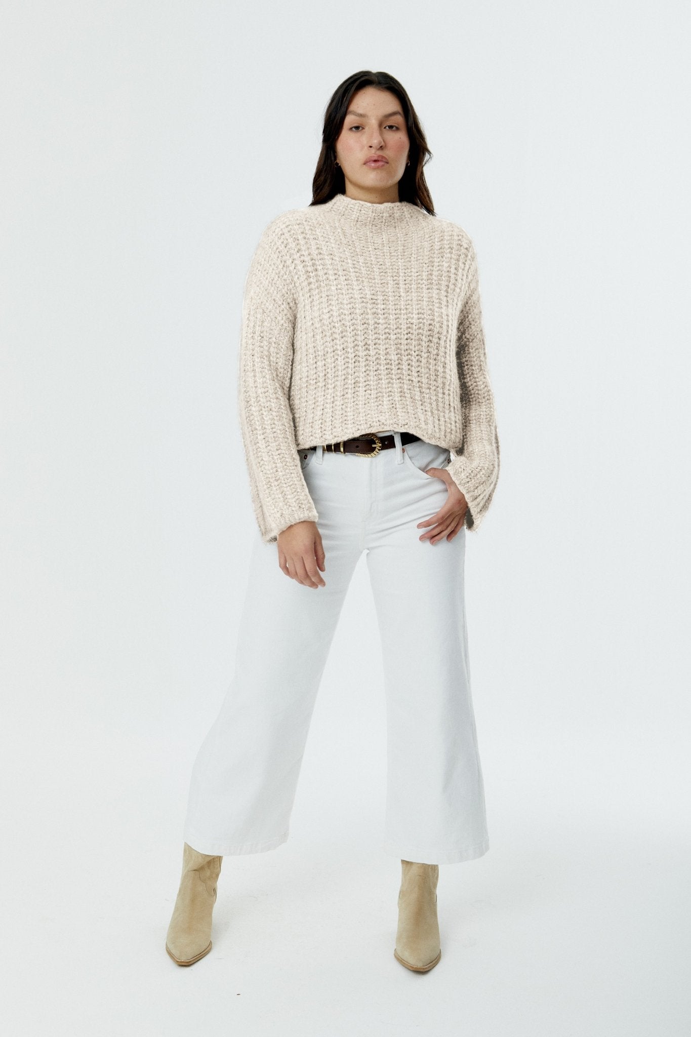 The Lita Mockneck is knit from Tirarik yarn, an airy-yet-warm blend known for its soft and rich texture. This cropped silhouette features a plush mock neckline, subtly flared sleeves, and a boxy, relaxed body that makes for easy layering. The distinct waffle-stitch structure adds depth and warmth without weight, while the brushed finish lends a tactile softness against the skin.