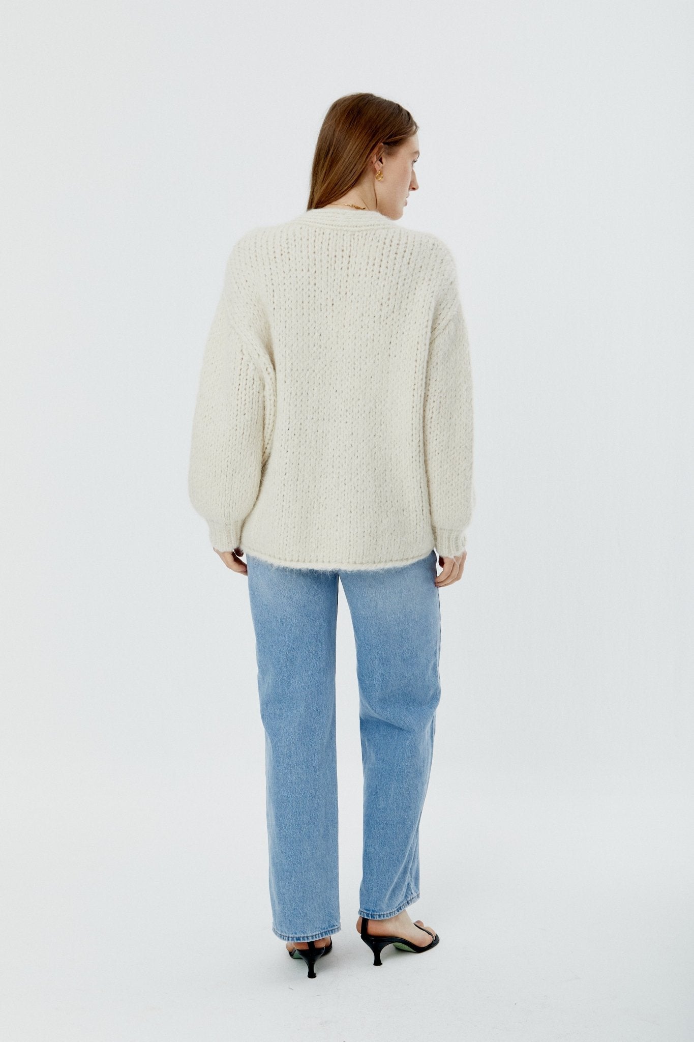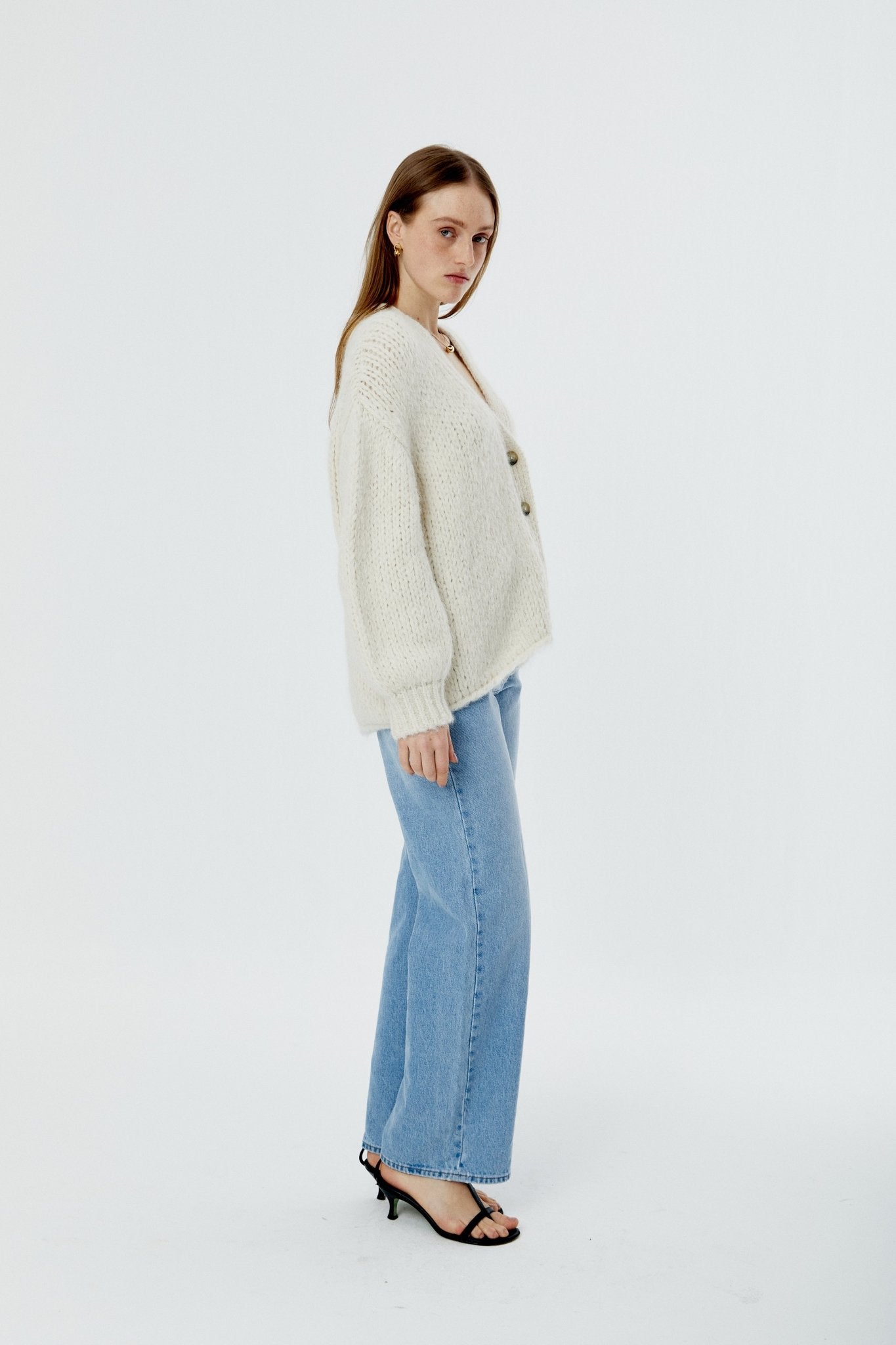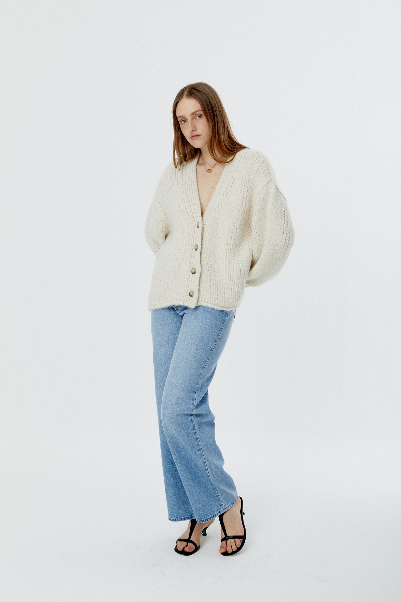 Crafted for softness and structure, the Isla Cardigan is made from a chunky Tirarik yarn for a cozy yet breathable finish. Designed with a deep V-neckline, this relaxed silhouette features full-length sleeves, a clean button front, and a softly rolled hem for a lived-in feel. The open gauge adds gentle drape and texture, ideal for elevated comfort.