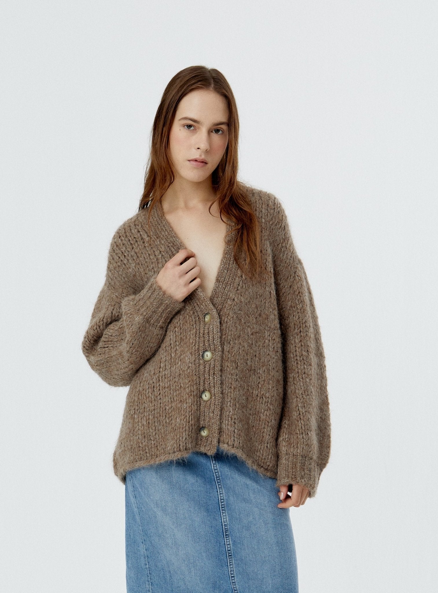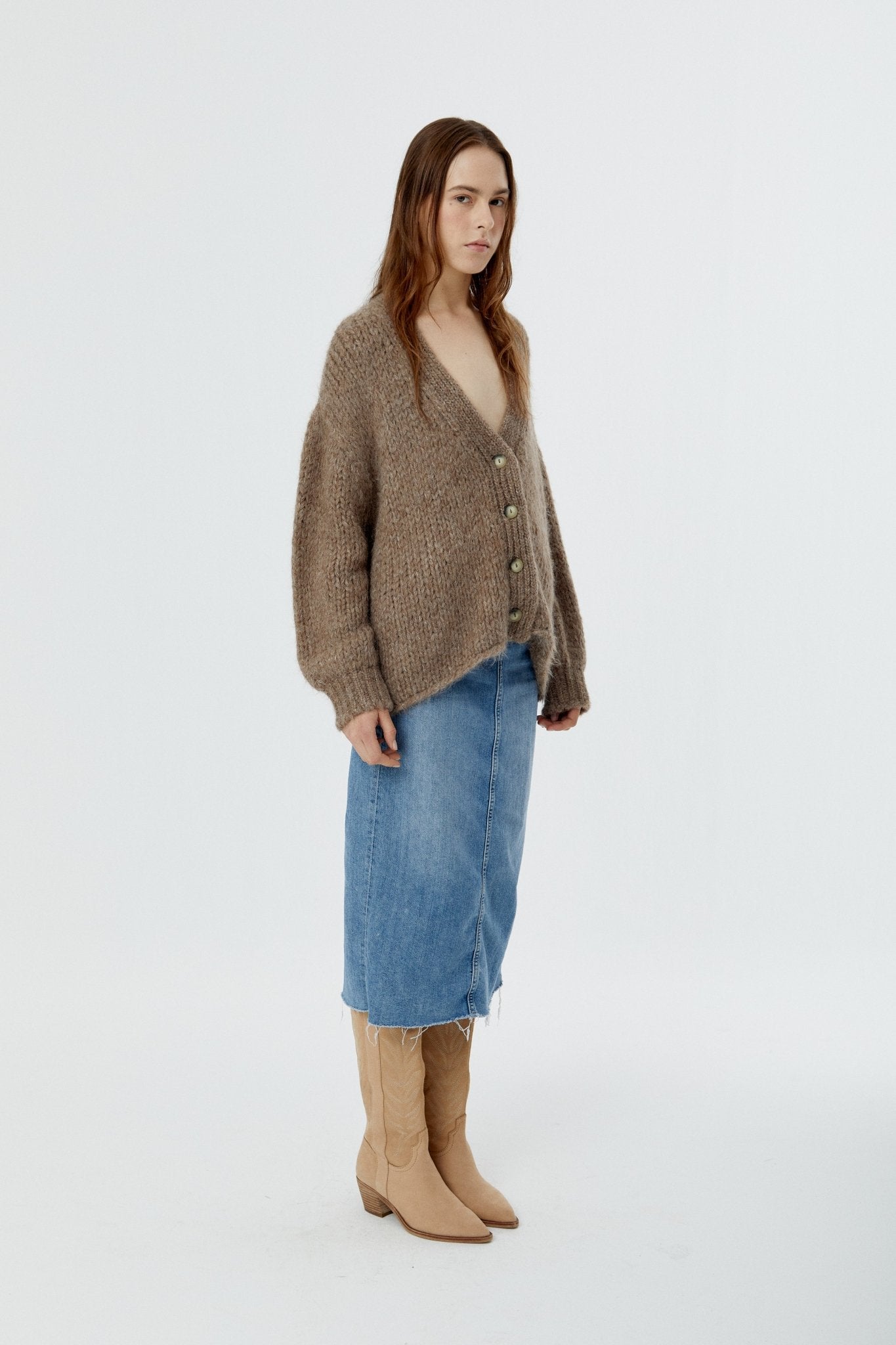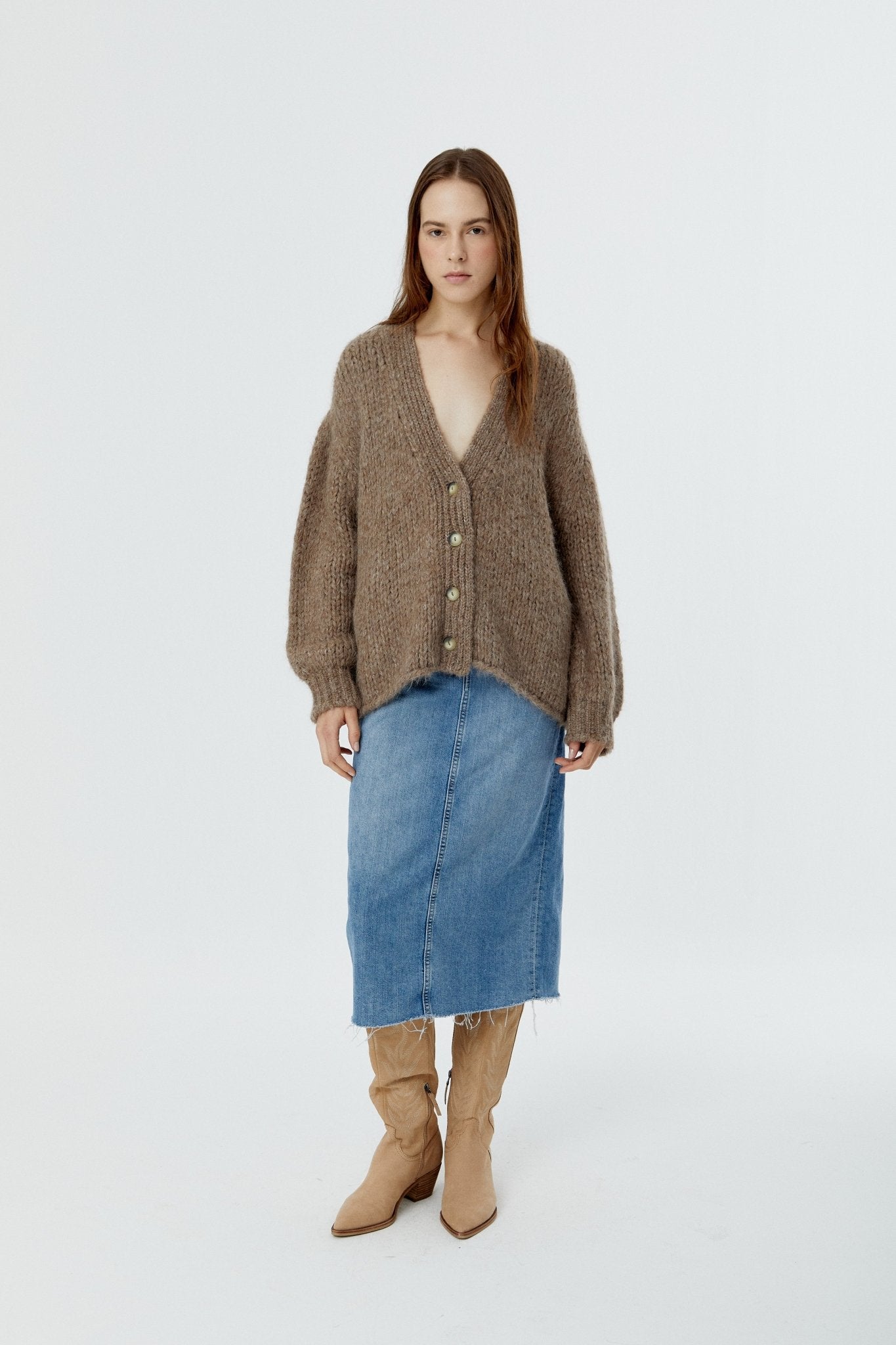 Crafted for softness and structure, the Isla Cardigan is made from a chunky Tirarik yarn for a cozy yet breathable finish. Designed with a deep V-neckline, this relaxed silhouette features full-length sleeves, a clean button front, and a softly rolled hem for a lived-in feel. The open gauge adds gentle drape and texture, ideal for elevated comfort.