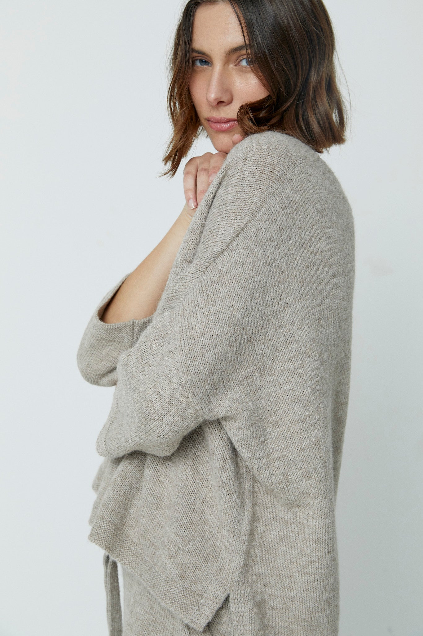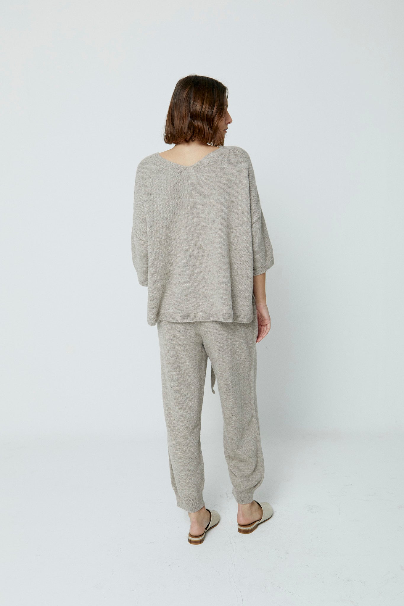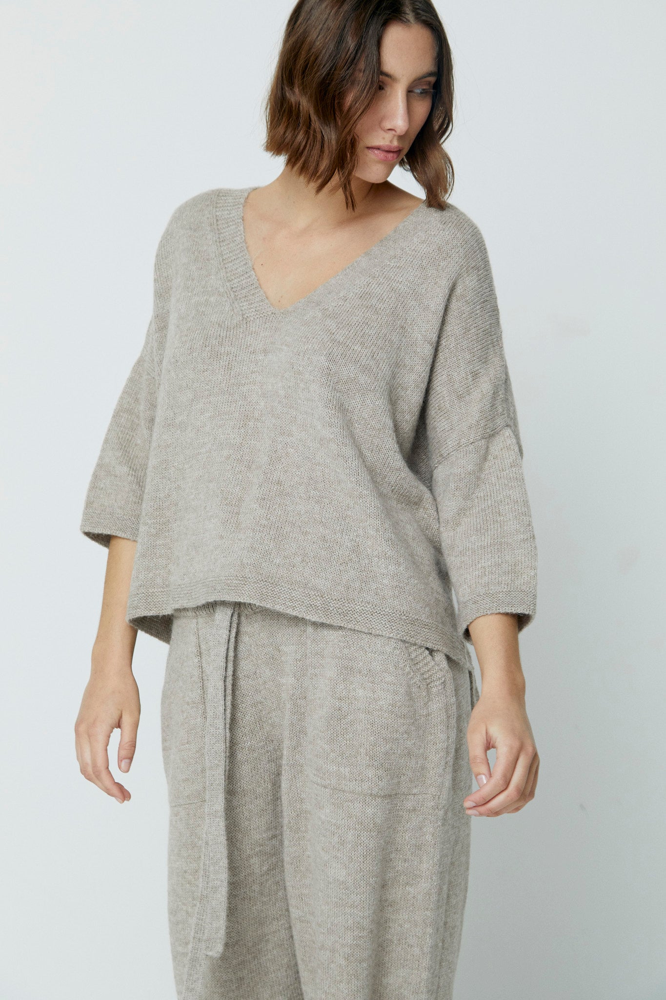 Elevate your wardrobe with the Zoe Top, crafted from luxurious baby alpaca wool. This timeless piece has an exaggerated boxy shape, deep v-neck and dropped shoulders with quarter-length sleeves. The ideal piece for layering or wearing solo. The Zoe Top has a relaxed fit with a flattering drape, perfect for effortless, everyday style. Pair it with our Zoe Pants for the ultimate lounge set. A must-have staple that brings an understated elegance.